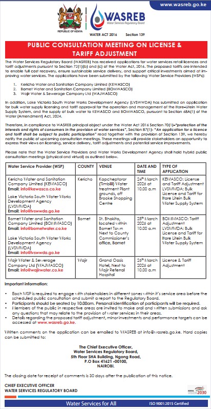 NewsNoticesPublic ConsultationPUBLIC CONSULTATION MEETINGS ON LICENSE AND TARIFF ADJUSTMENTS FOR THREE (3NO.) WATER SERVICE PROVIDERS (WSPs)PUBLIC CONSULTATION MEETINGS ON LICENSE AND TARIFF ADJUSTMENTS FOR THREE (3NO.) WATER SERVICE PROVIDERS (WSPs)Gideon TererMarch 10, 2026 Notices, Public Consultation1 min read Download Notice Document
