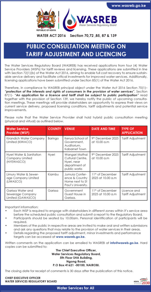 NewsNoticesPublic ConsultationPUBLIC CONSULTATION MEETINGS ON TARIFF FOR FOUR (4NO.) WATER SERVICE PROVIDERS (WSPs)PUBLIC CONSULTATION MEETINGS ON TARIFF FOR FOUR (4NO.) WATER SERVICE PROVIDERS (WSPs)Daniel KaranjaNovember 19, 2025 Notices, Public Consultation1 min read Download NYERI Tariff Details Download KIRANDICH Tariff Details Download LIMURU Tariff Details Download GARISA Tariff Details
